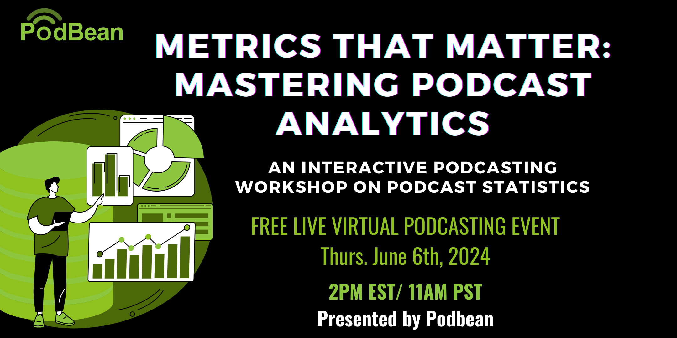 Join the Podbean team for "Metrics that Matter: Mastering Podcast Analytics," a one-hour deep dive into the world of podcast analytics. This virtual event is tailored for podcasters at all levels who are keen to leverage analytics for sustainable growth, featuring expert insights directly from those who know the platform best. What You Will Learn: Understanding Key Podcast Metrics: Explore essential stats like download numbers, listener demographics, episode retention rates, and engagement analytics. Learn from the Podbean team how these metrics can directly influence your podcast's success. Live Demo of Analytics Tools: Experience a real-time walkthrough with the Podbean team, demonstrating how to navigate and utilize analytics tools effectively for your podcast. Actionable Insights from Analytics: The Podbean experts will guide you through interpreting your data to make informed decisions that improve content quality, optimize publishing schedules, and refine marketing strategies. Tracking Your Podcast's Progress: Discover how to set realistic goals and benchmarks with the Podbean team’s insider tips, and learn the best practices for monitoring your performance effectively. Decoding Industry Terms: Gain clarity on common but often misunderstood industry terms and standards, moving beyond just IAB compliance to ensure you fully grasp what these metrics mean and how they can be applied to your growth strategy. Who Should Attend: This webinar is perfect for any podcaster looking to deepen their understanding of podcast analytics, use data-driven strategies to enhance their show, and learn the language of podcast metrics fluently. Join Us: Don't miss this opportunity to empower your podcast with precise analytics and expert knowledge. Whether you’re refining your content strategy or scaling your marketing efforts, this event will equip you with the essential tools and knowledge. You'll also be able to ask your questions LIVE on YouTube where you can join the conversation, ask your questions in real-time and watch the replay!